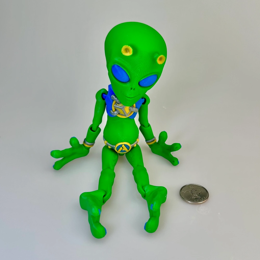 Its sculpted accessories, such as the chest harness and belt emblem, add extra character and make the design instantly recognizable. The articulated limbs allow the alien to sit, pose, and display in a variety of playful positions, making it perfect for desks, shelves, or as a unique collectible gift.