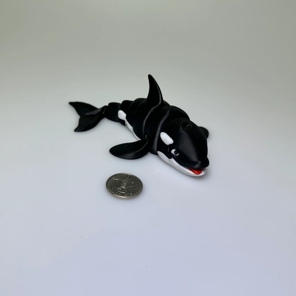 This Orca is a beautifully articulated miniature inspired by the power and elegance of the real killer whale. Designed with a flexible, segmented body, the model features smooth curves, a tall dorsal fin, and the classic black‑and‑white markings that make orcas so iconic.