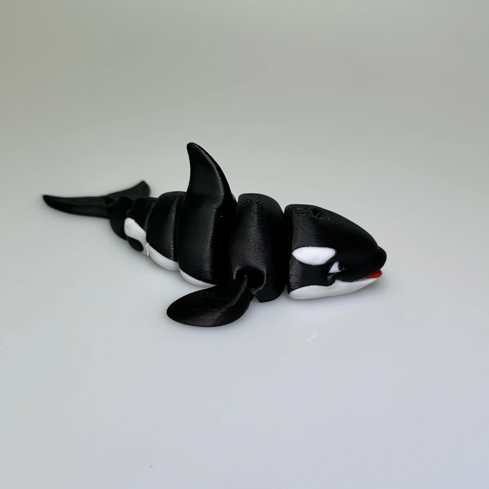 Each connected segment allows the orca to bend and flow naturally, mimicking the graceful movement of a swimming whale. Despite its small size, the details are crisp — from the eye patches to the tail flukes — making it a charming display piece, fidget toy, or collectible for marine‑life fans.